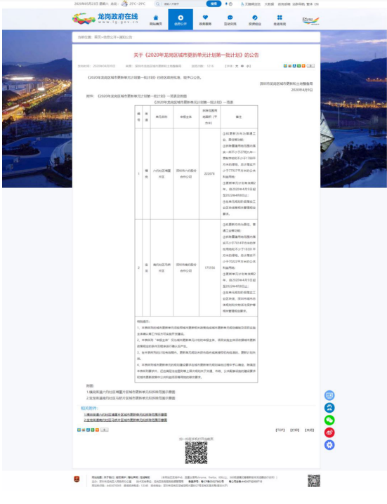 馬橋項目更新意愿、立項已在深圳市龍崗區政府網站上公示,根據公示的“更新單元計劃”。