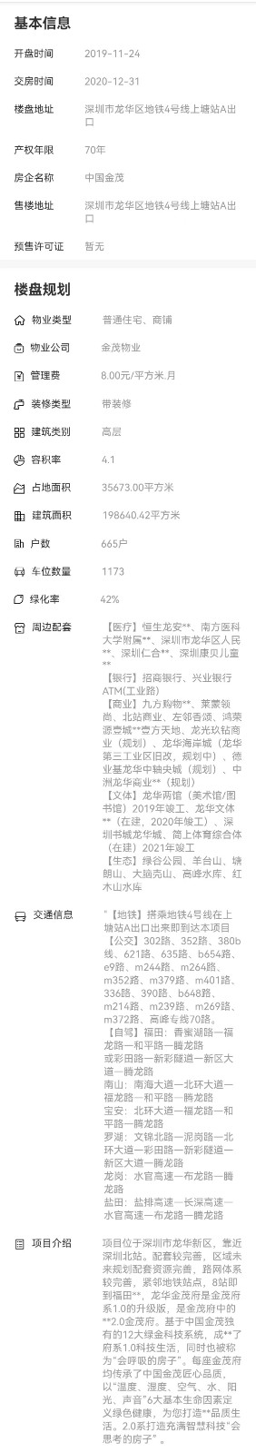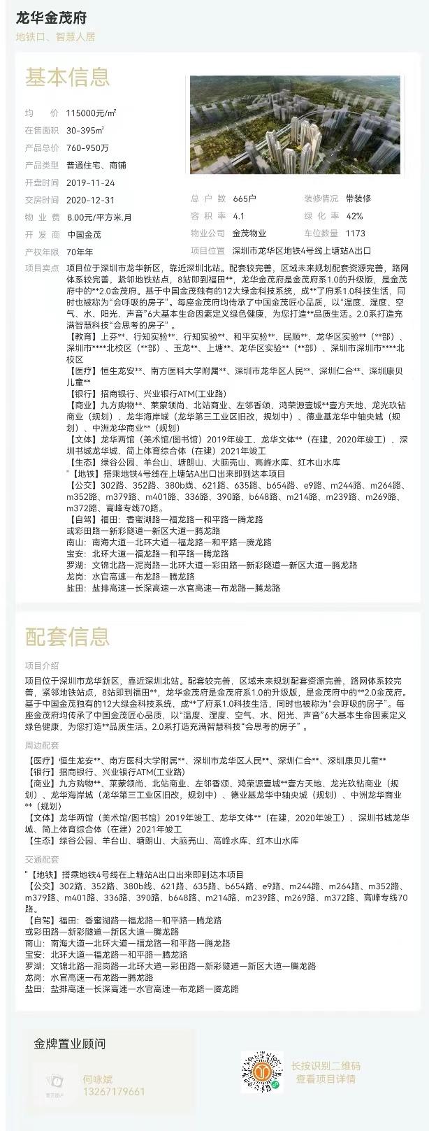 項目位于深圳市龍華新區,靠近深圳北站。配套較完善,區域未來規劃配套資源完善,路網體系較完善,緊鄰地鐵站點,8站即到福田**,龍華金茂府是金茂府系1.0的升級版,是金茂府中的**2.0金茂府。基于中國金茂獨有的12大綠金科技系統,成**了府系1.0科技生活,同時也被稱為“會呼吸的房子”。每座金茂府均傳承了中國金茂匠心品質,以“溫度、濕度、空氣、水、陽光、聲音”6大基本生命因素定義綠色健康,為您打造**品質生活。2.0系打造充滿智慧科技“會思考的房子” 。