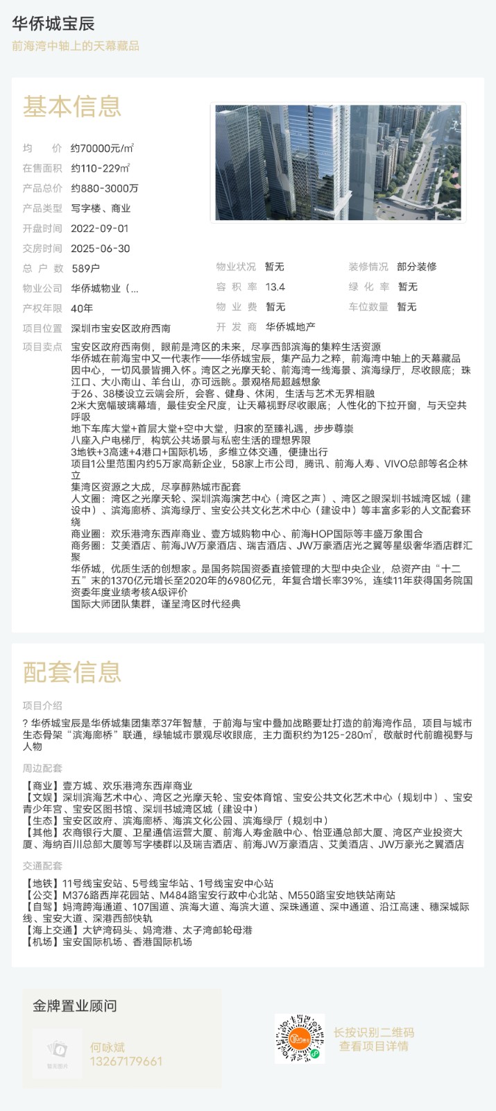 樓盤:華僑城寶辰物業類型:寫字樓、商業戶型:1室面積:約110-229平米總價:約880-3000萬聯系人:何詠斌聯系電話:13267179661